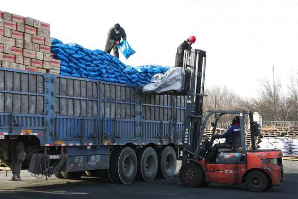 哈密市藍(lán)色火宴新能源開發(fā)有限責(zé)任公司工人在裝載銷售產(chǎn)品。( 記者 邢寶玉)