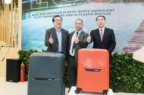 在蘇伊士展臺(tái)上,新秀麗集團(tuán)大中華區(qū)總裁馬瑞國(guó)、利安德巴賽爾中國(guó)合資企業(yè)管理及聚烯烴業(yè)務(wù)副總裁付立民、蘇伊士亞洲地區(qū)固廢資源管理固廢基建及新服務(wù)業(yè)務(wù)總監(jiān)古山主持揭幕儀式,攜手推出由回收塑料制成的可持續(xù)發(fā)展系列旅行箱,展示了三方共同致力于減少碳足跡,賦予塑料廢棄物第二次生命,減少原始材料的使用的愿景。