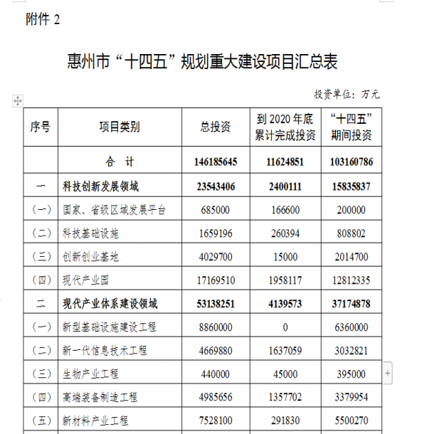 6月3日,惠州市政府正式對(duì)外公布《惠州市國(guó)民經(jīng)濟(jì)和社會(huì)發(fā)展第十四個(gè)五年規(guī)劃和2035年遠(yuǎn)景目標(biāo)綱要》(下稱《綱要》)。其中明確提出,“十四五”期間規(guī)劃建設(shè)重大項(xiàng)目312宗,計(jì)劃總投資近1.5萬億元,“十四五”期間計(jì)劃投資10316億元。