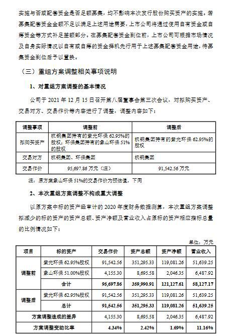 綜合考慮象山環(huán)保的項(xiàng)目運(yùn)營情況、盈利能力及其對于上市公司重組完成后盈利能力的影響后,上市公司董事會本著增厚上市公司收益的交易原則,審慎修訂了本次交易標(biāo)的范圍。最終,公司決定調(diào)整本次重組方案,將收購的標(biāo)的資產(chǎn)范圍由紫光環(huán)保62.95%股權(quán)和象山環(huán)保51.00%股權(quán)變更為紫光環(huán)保62.95%股權(quán)。